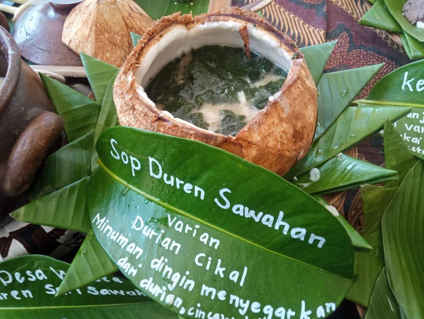 Wisatawan menikmati makanan khas desa seperti nasi thiwul, nasi putih, kare ikan lumedanh/blencing, urap, sayur pakis, sayur lompong, kothok kemangi tahu tempe, gembrot (bothok beluntas), kerupuk, kolak kaling kaling, sop durian, dan snack khas desa.