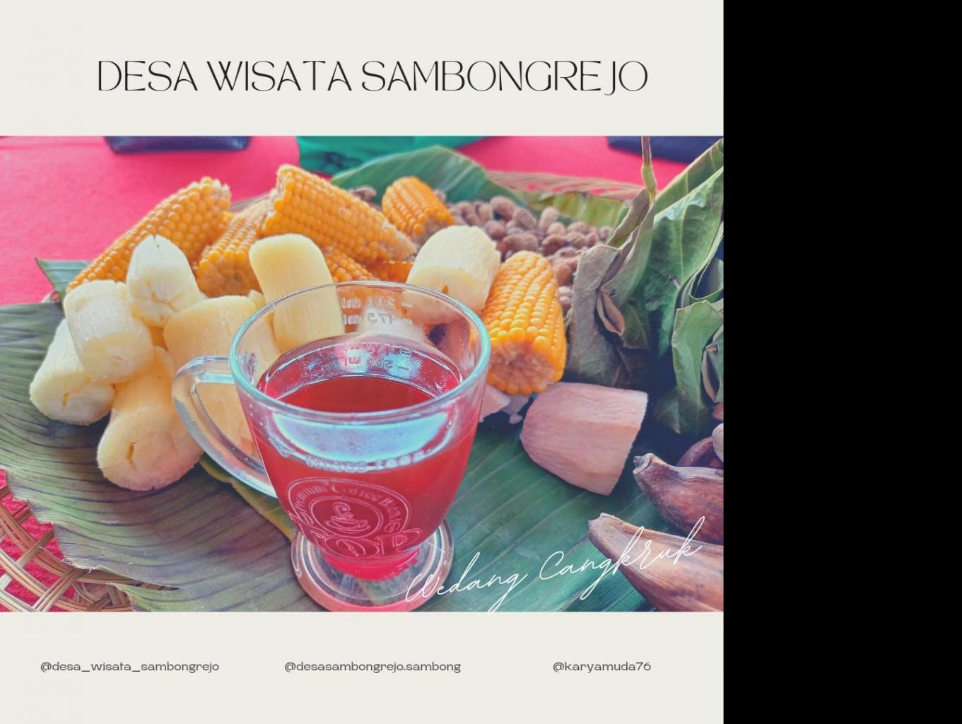 Wedang Cangkruk merupakan salah satu minuman khas di desa wisata Sambongrejo, yang dimana minuman ini di sajikan ketika tamu datang berkunjung ke desa kami. Warna merah dari wedang Cangkruk ini didapat dari kulit kayu secang yg direbus. Selain menyegarkan, bahan-bahan alami yang digunakan untuk membuat wedang ini juga dapat menyehatkan tubuh serta harganya yang terjangkau.